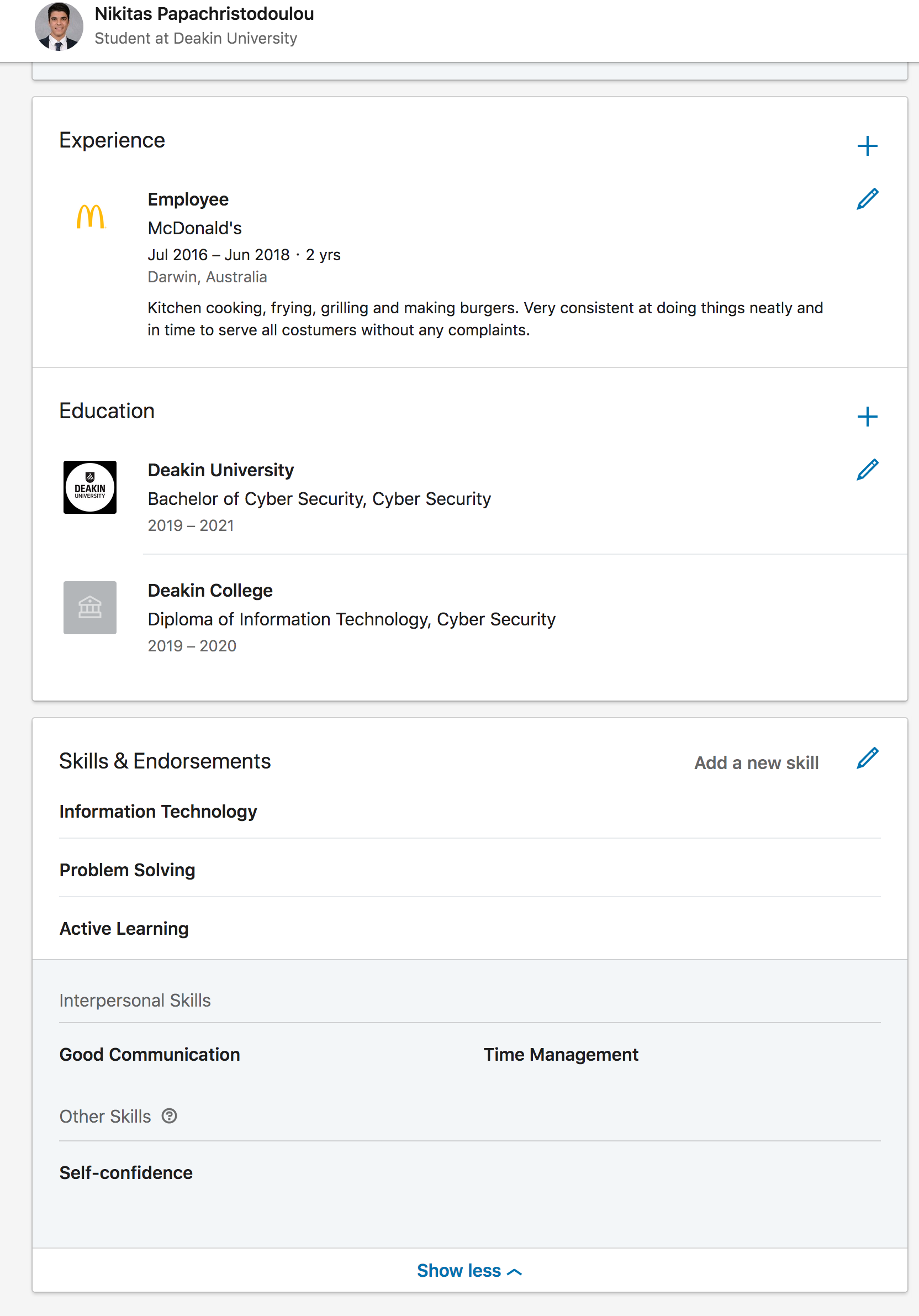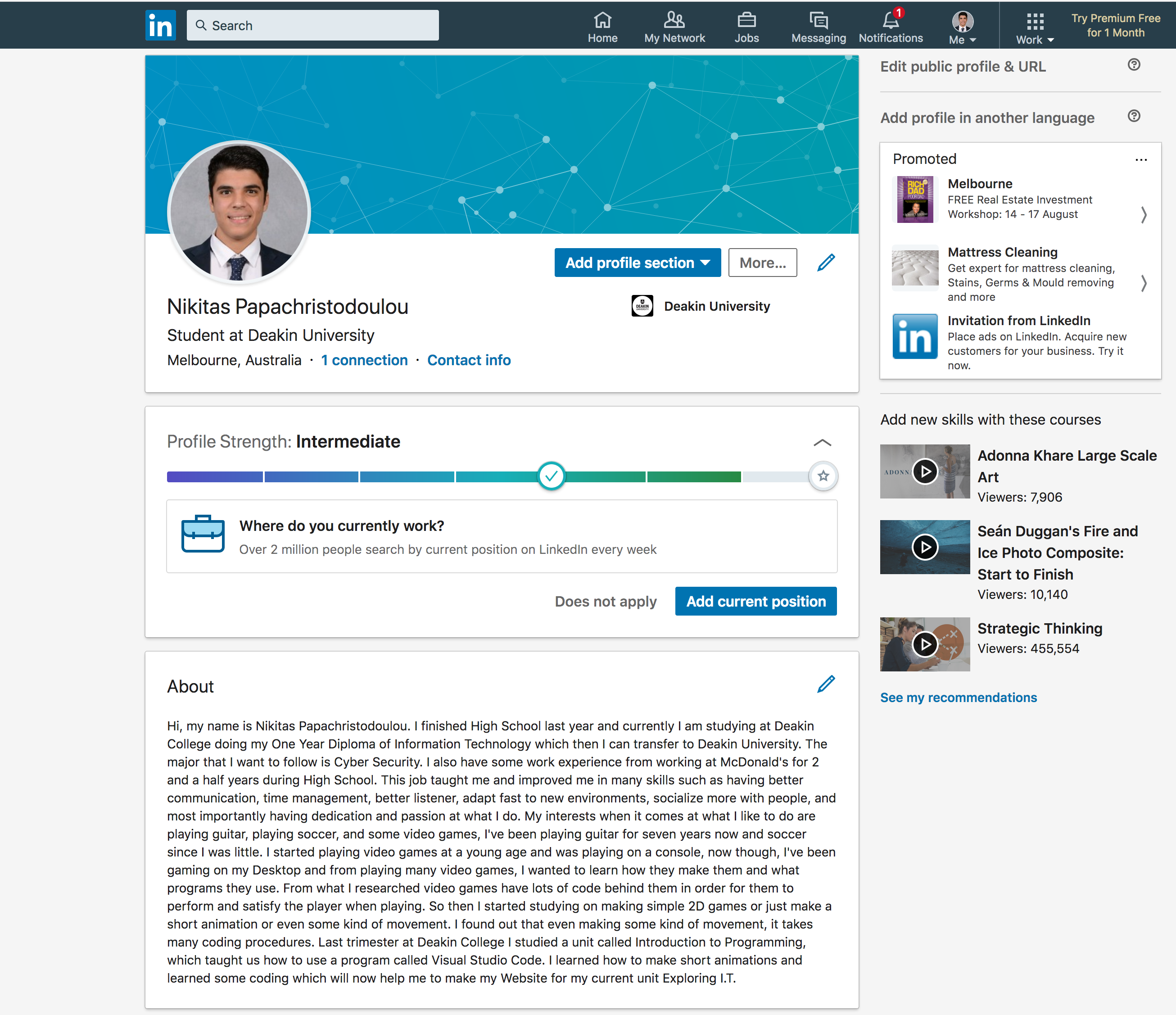 My LinkedIn profile includes a summary of myself, career interests, work experience and my key skills. I follow many people that would help me on my career field if I need help and also looking for jobs that match my future career after University.
